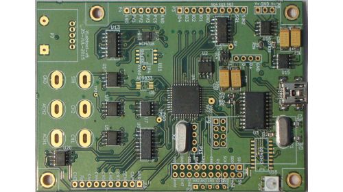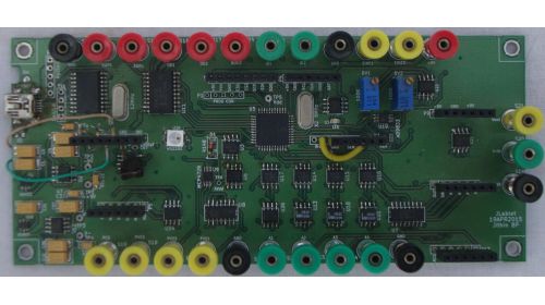 Sent the first design for fabrication. Used a PIC24EP64GP204 micro-controller. Initial goal was to implement a 4-channel scope with at least 1 msps per channel, inputs with programmable voltage range etc. For waveform generation, added an ATTiny processor from Atmel. A 2 channel SPI DAC was used.