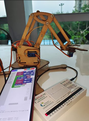 This 4-DOF affordable robotic arm can be controlled via your phone using the visual coding interface. SEELab3 controls the servos via a PCA9685 servo controller, and responds to hand gestures detected with AI.